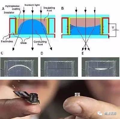 我們知道,鏡面的理想曲線是一條拋物線,不同曲率的拋物線其焦距不一樣。傳統(tǒng)的變焦鏡頭是通過(guò)調(diào)整兩個(gè)固定焦距的鏡頭之間的距離來(lái)實(shí)現(xiàn)變焦。而液態(tài)鏡頭目前隨著技術(shù)變化,也分好幾種。如:反射式液體鏡頭——旋轉(zhuǎn)水銀,得到一個(gè)理想的拋物面;自適應(yīng)性液態(tài)照相機(jī)鏡頭——由一對(duì)水滴組成,它們暴露于高頻聲波下往返振動(dòng),隨之改變透鏡的焦距;介電式液態(tài)鏡頭——使用液體聚焦光線,通過(guò)不同的電壓改變液體的形狀從而控制成像。有使用一種液體的,也有使用發(fā)射率不同的完全不能融合的兩種液體的。(還有的使用液態(tài)硅等等,就不一一列舉)