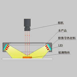 環(huán)形光源由高亮LED陣列特殊設(shè)計而成,以水平為基準(zhǔn),夾角為30度,檢測物體的邊緣清晰特征。